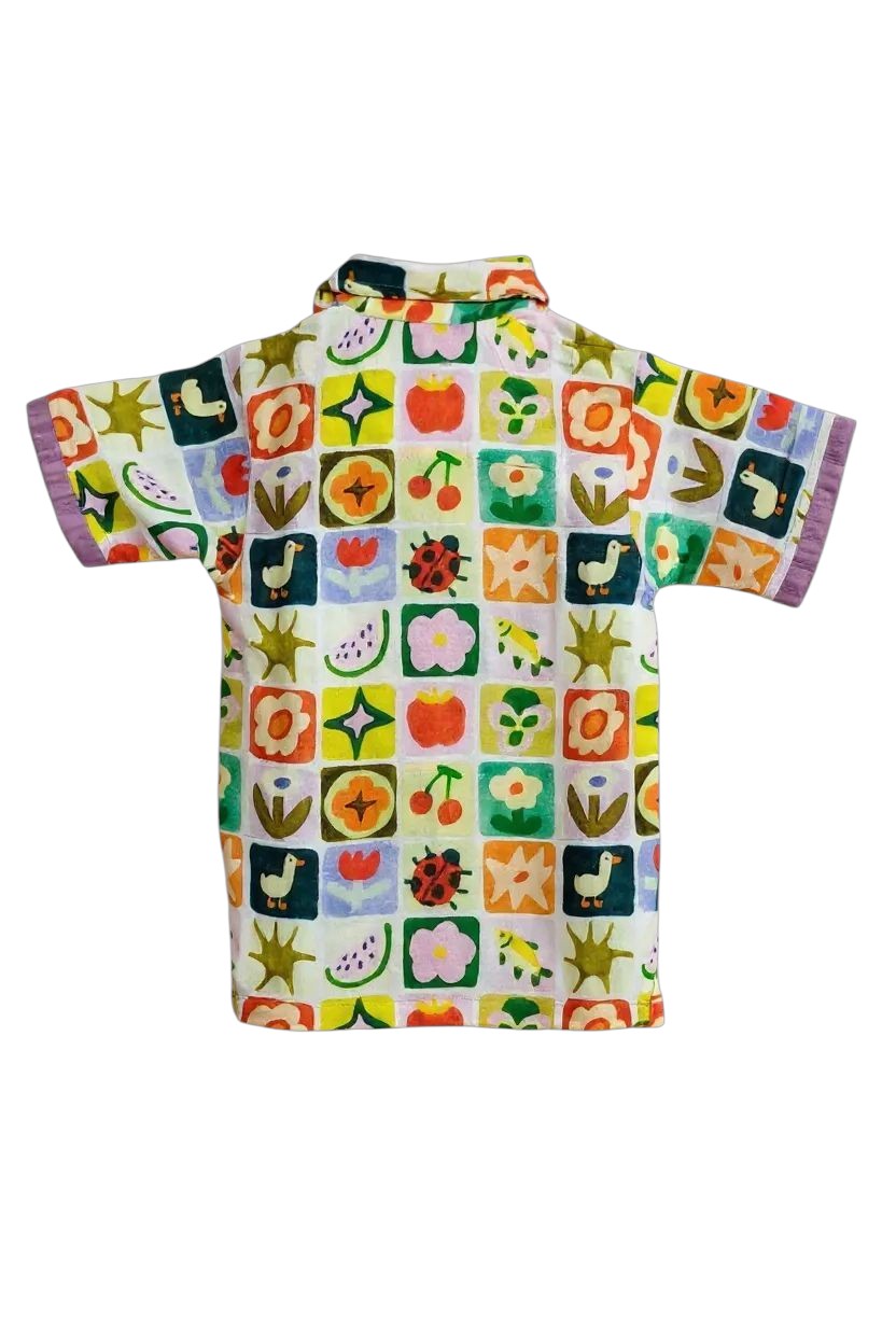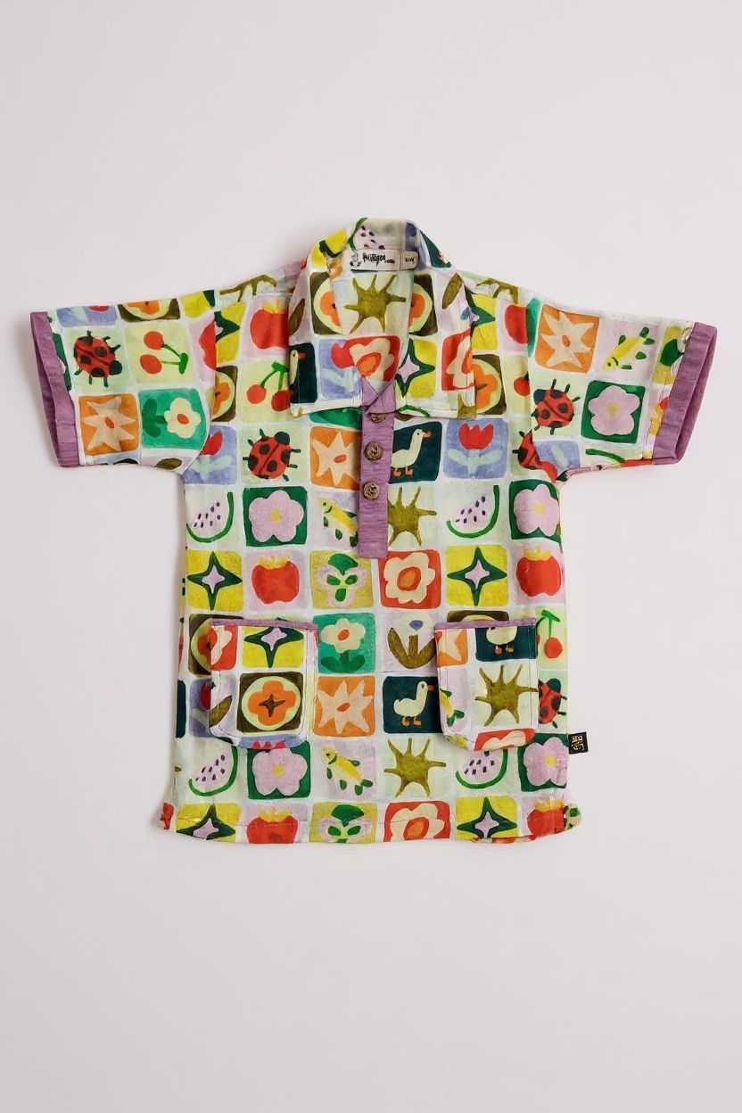 Say hello to garden magic! The Critter Patch Demi Collar Shirt is sprinkled with the cutest mix of flowers, ladybugs, fruits, and sunshine motifs — inspired by backyard wonder. Crafted in a gentle Viscose Linen, it’s cool, comfy, and made for kids who love to chase butterflies and dream big.