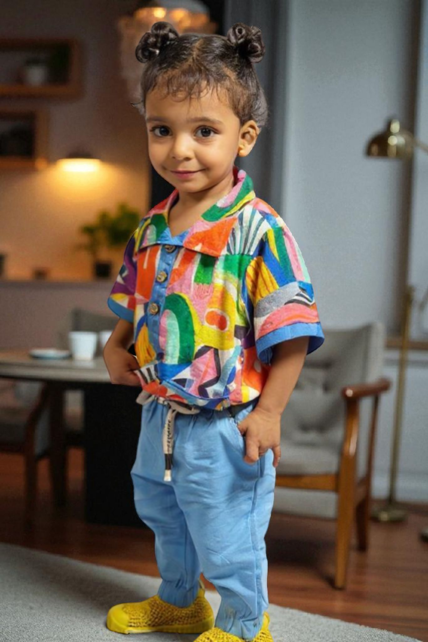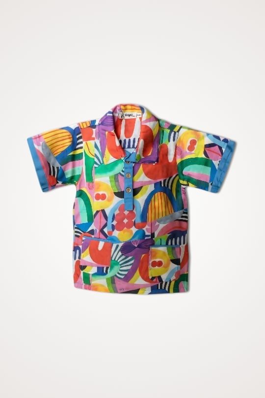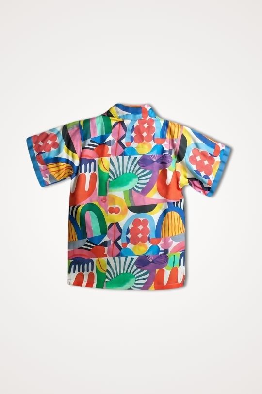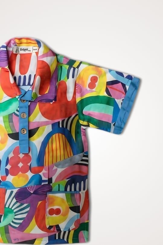 Unleash your mini artist’s spirit with this joyful explosion of color and curves! Covered in abstract doodles and juicy brights, this Flora ’73 Demi Collar shirt is like wearing a walking masterpiece. Made in soft, breathable cotton-linen and finished with contrast wooden buttons, it’s perfect for curious minds and wild adventures. Every inch oozes fun and drama—because why blend in when you were born to stand out?