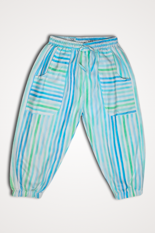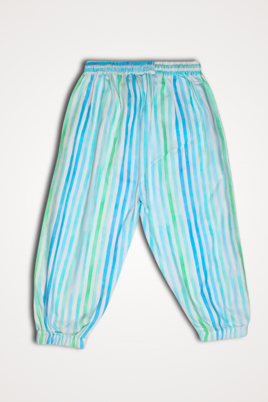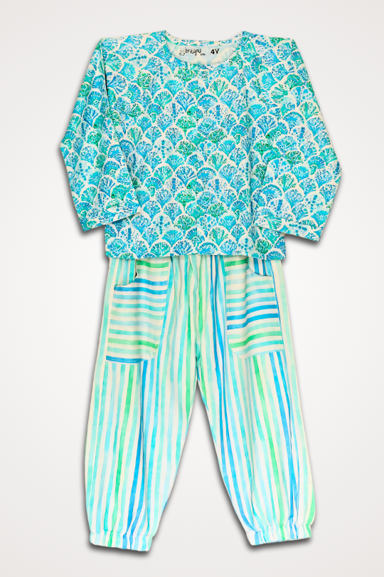 A fresh gust of summer wrapped in style! This charming co-ord set features a long-sleeved cotton top adorned with delicate blue hand-block motifs, paired effortlessly with relaxed striped harem pants in soothing sea shades. Thoughtfully crafted for comfort and freedom, it’s perfect for curious little explorers. Whether it’s a breezy day out or a cozy evening in, this set brings effortless charm and all-day wearability.