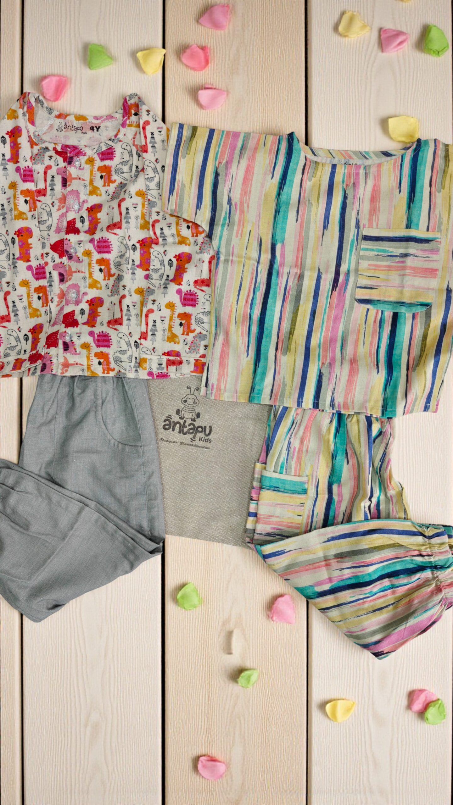 In this bundle, you will get the Candy Stripes Co-ord Set and the Roar and Explore Co-ord Set — a fun mix of sweet stripes and adventurous prints for every playful day.